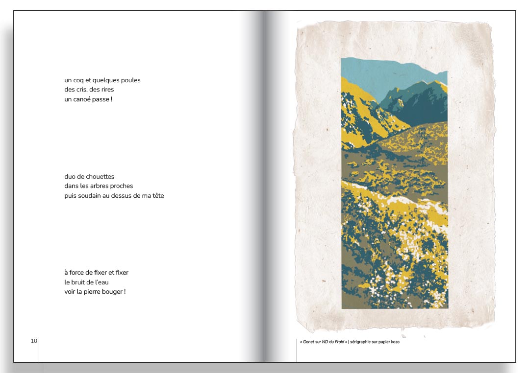 Les créations graphiques de ce recueil ponctuent les haïkus, sans en être l’illustration. Les originaux sont créées et sérigraphiés par Véronique Bianchi. Elle a choisi d’imprimer artisanalement sur papier japonais kozo qu’elle fabrique dans son atelier avec les matières premières récoltées (murier, folle-avoine… )